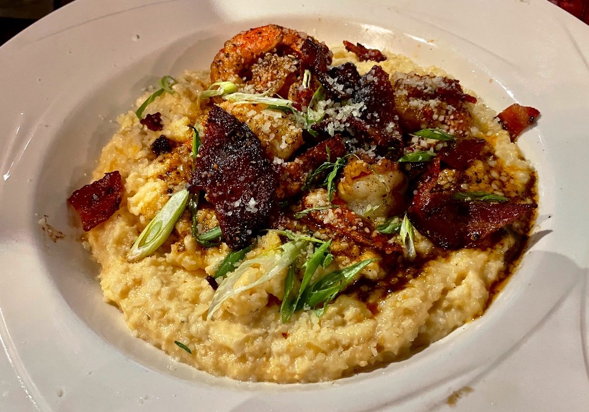 - SHRIMP & GRITS: Blackened shrimp served over cheesy grits, complemented by maple bourbon bacon.